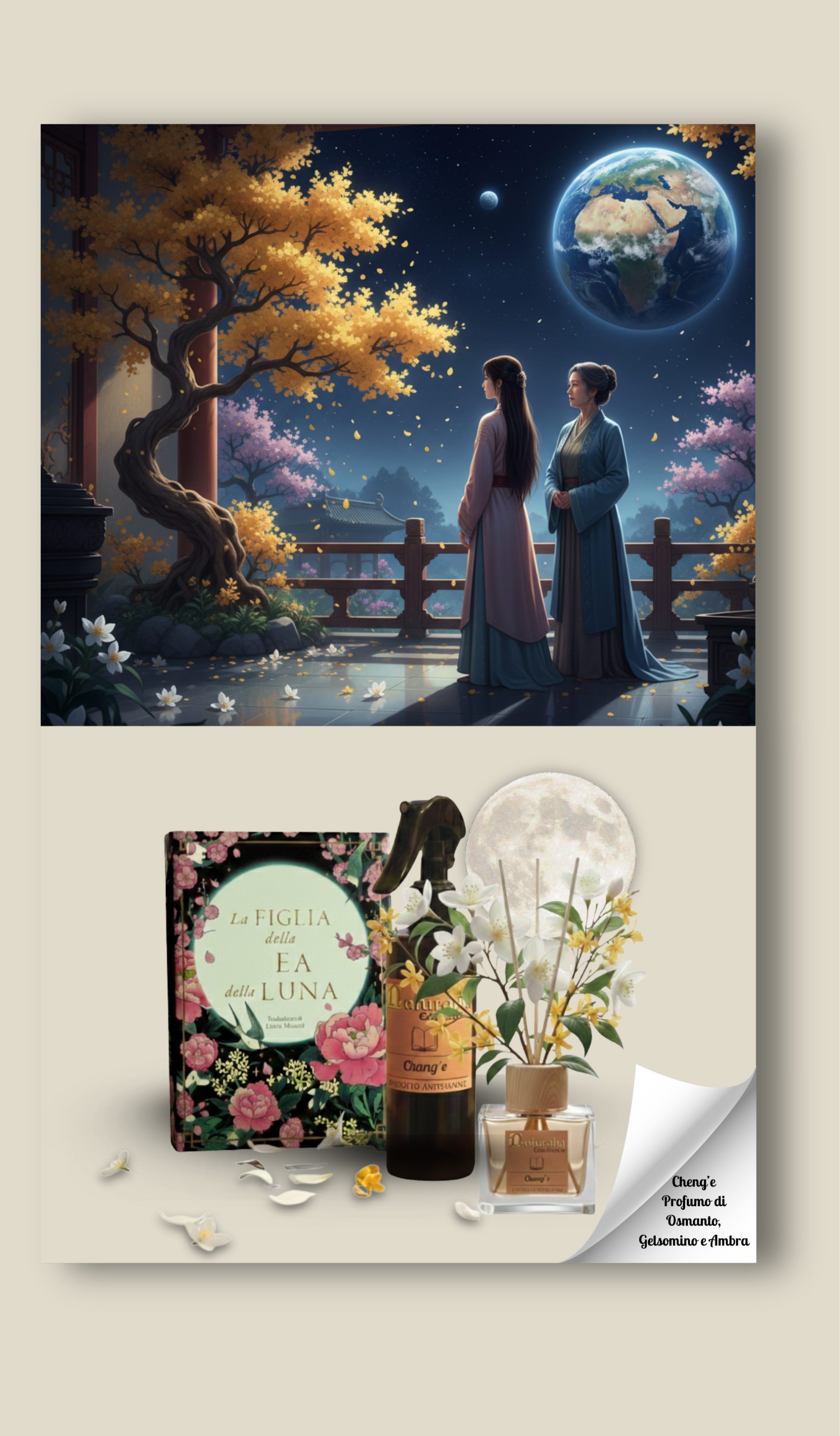 Chang’è abita la Luna, sospesa tra luce e nostalgia. La leggenda racconta che accanto a lei cresca un grande albero di Osmanto, i cui fiori dorati profumano l’aria celeste con una dolcezza sottile. È quel profumo a farle compagnia nelle notti silenziose, un legame delicato con il mondo che ha lasciato.